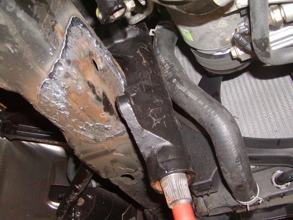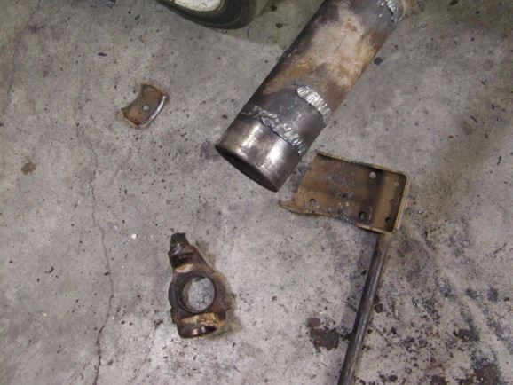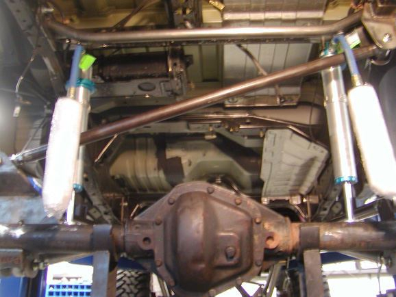 With the axles in place, Beau took some dimensions and designed the track bar brackets and shock mounts. While he was getting the brackets cut out, Phil built the track bars using 1.5"x.219 wall DOM tubing. He used a poly bushing at the frame side, and a 3/4 Chromoly heim at the axle end. The same material was used to make the draglink and tie-rod. The draglink was mounted to a WFO crossover steering arm on the axle end, and a Wagoneer pitman arm on the box end. The tie-rod mounted in the factory location; however the knuckles were reamed from the top down to give an extra 3" of clearance.