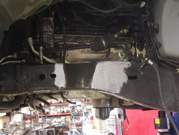 The front shock mounts were then bent from 1.5"x.120 wall tubing. Two kickers were also added on each side for extra strength. Before the shock towers were welded in place, the height and location was checked with our mock-up shocks. We made sure that the factory inner fender wells would bolt back into place, and that the shock tabs were in the correct location. The towers were then pulled off one more time and painted before finally being welded into place. The 2.5"x14" King shocks were then bolted in. Lastly, a frame brace was built and bolted between the two front frame rails, directly below the harmonic balancer.
