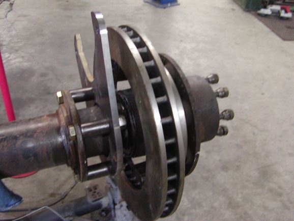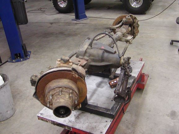 Our original idea was to install a new Eaton E-locker. However, we soon found that the locker was on back order. Rather than settle on anything else, we decided to wait out the back order. In the meantime, we installed a new 35 spline carrier with our Sierra 5.38 gears. We also removed the original drum brakes, and installed a set of WFO disc brake brackets; using 13" vented rotors and Chevy brake calipers. The Link mounts and brackets were then welded to the Rear housing.