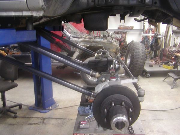 The next order of business was the brake lines and the driveline. New stainless brake lines were built to take the place of the factory rubber lines. The original driveline was bolted in, and checked for clearance. It was a hair short, due to the fact that the front axle was moved around 3” forward. Luckily, with a link setup, the driveline does not need much movement in and out. The CV had already been clearanced for maximum angle. Rather than buy a $600 high angle driveline right then, we decided to make due with Brent’s driveline. The front suspension was drooped out, while spinning the driveline at the same time.