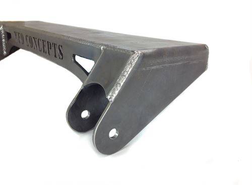 This hanger has the standard 31.5" spring center to center that is found on Chevy or 78/79 Ford solid front axles. It is designed to use 2.5" wide leaf springs with 1/4" wide bushings. This makes the width between the spring tabs 3". Simply place this where you would like and weld it to your frame! The center of the spring bolt is dropped down 4.75" and pushed forward 1.5". The bolt holes are 9/16".